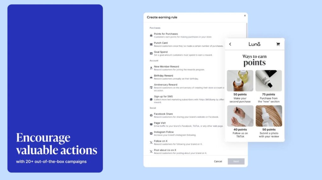 Yotpo is known for Shopify product reviews, but its Loyalty & Referrals app is equally powerful. It seamlessly connects your review, SMS, and loyalty systems into one data-rich platform. You can customize how customers earn rewards, including for submitting Shopify customer reviews.