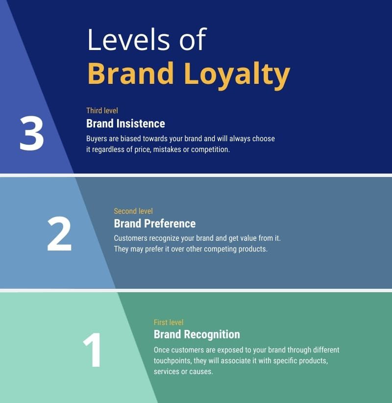 The four key loyalty levels – Awareness, Consideration, Repeat Purchase, Advocacy – represent the customer journey from first brand contact through to being a vocal brand advocate. Here’s a quick breakdown: