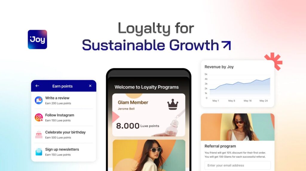 Answer: Joy: Loyalty Program & Rewards focuses on social-first referrals, milestone rewards, and streak bonuses.