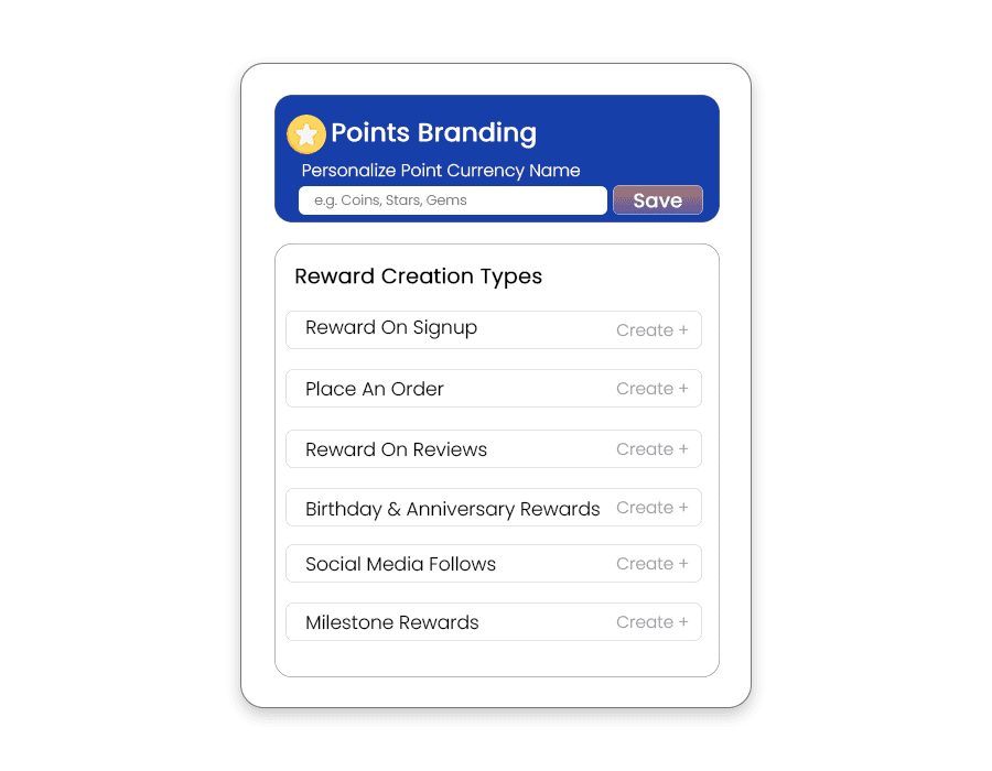 Personalize how your customers see and redeem their points. Retenzy loyalty app grants you the ability to personalize the name of the currency (Coins, Stars, Gems, etc), customize how your customers earn points, and game-ify the shopping experience with milestone incentives.