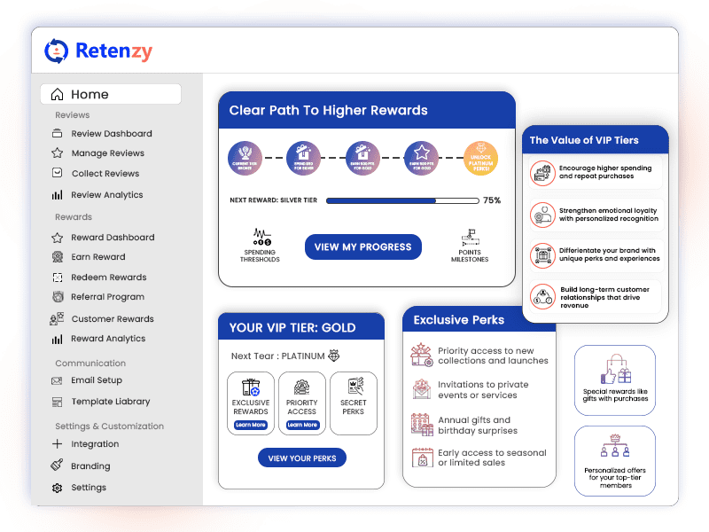 Turn loyalty into a journey. With Retenzy’s VIP Tiers, you can design a tiered rewards program that motivates shoppers to keep moving forward. Each tier unlocks bigger perks, exclusive experiences, and recognition that keeps customers connected to your brand while boosting sales and retention.