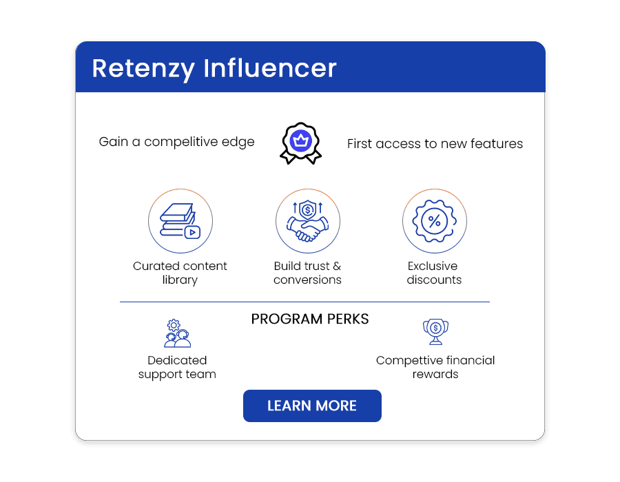 Join the Retenzy Influencer Program and partner with a fast-growing e-commerce loyalty platform. Get rewarded for sharing tools that help brands retain customers, boost sales, and grow faster.