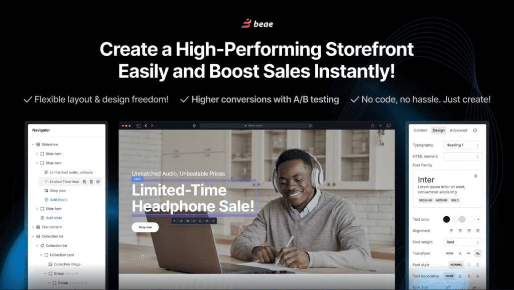 Beae proves that accessibility and quality aren’t mutually exclusive. Designed specifically for merchants without design background, it achieves a rare feat: an intuitive interface paired with production-ready results.