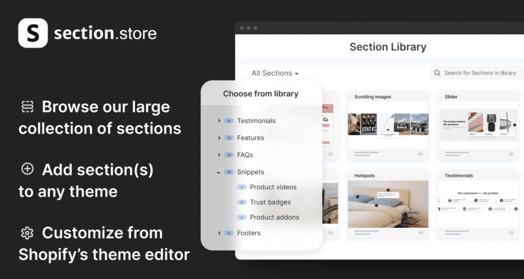 Section Store solves a different problem: you love your existing theme but need additional sections (trust badges, testimonials, countdown timers, FAQ, etc.) without overhauling your store.