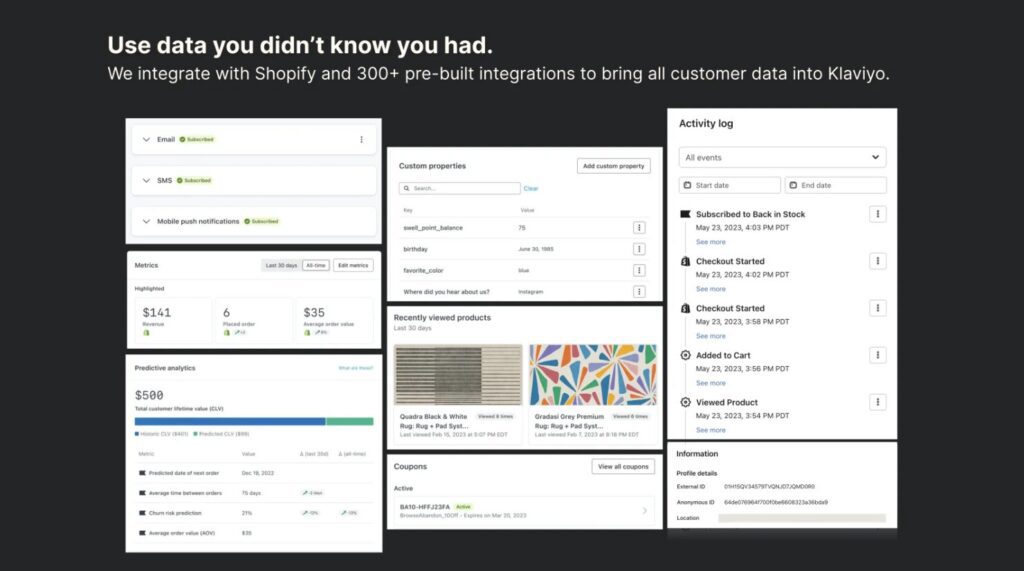 Klaviyo is the top ecommerce marketing platform within the Shopify ecosystem. Trusted by over 265,000 stores worldwide, Klaviyo helps businesses send personalized emails, SMS messages, signup forms, and much more. The platform is designed to grow with your business, supporting your journey from launch to building a billion-dollar brand, all without the need to switch platforms.