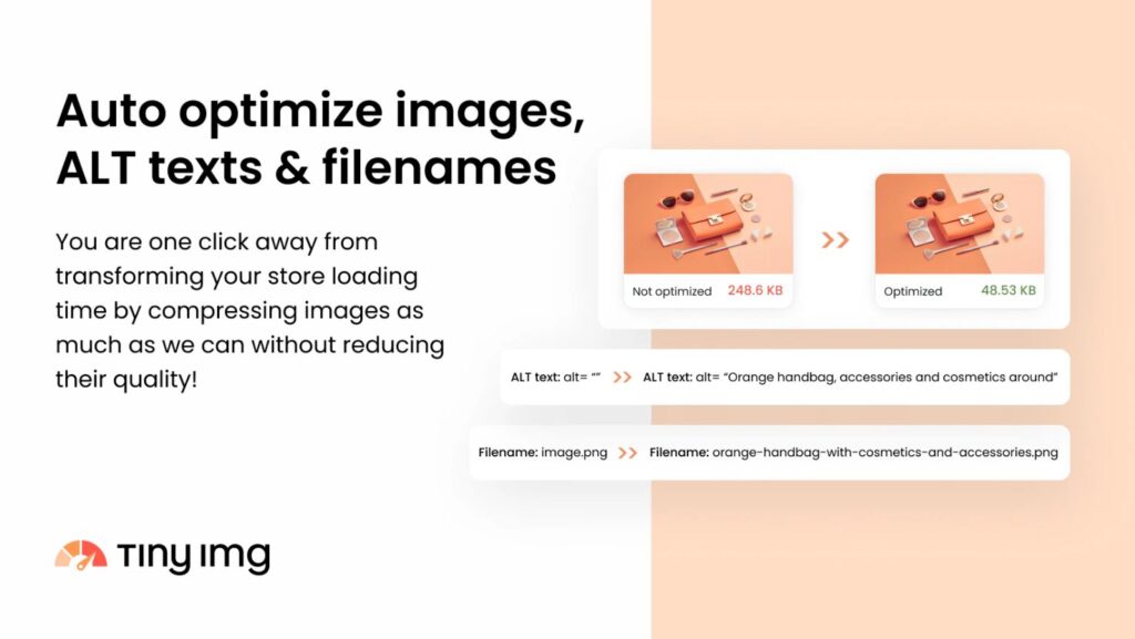 TinyIMG is one of the highest-rated image optimization apps on Shopify, offering automatic image compression, lazy loading, broken link redirection, and even structured data (JSON-LD) support. It also optimizes file names and alt-texts for better SEO and contributes directly to your Shopify speed optimization goals.